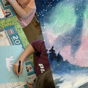 L’après-midi, ils peindront une aurore boréale en utilisant de l’aquarelle en tubes, (découverte du matériel spécifique, mouillage du papier, etc).