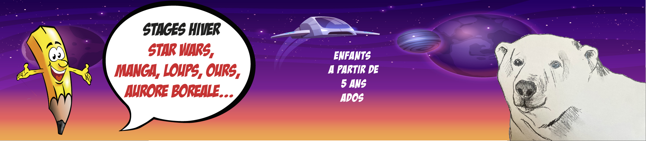 Ce stage s’adresse aux fans de l’univers de la célèbre série et filmographie des Star Wars ©. Votre enfant pourra représenter ses héros préférés par le dessin, mais aussi à travers l’utilisation de l’aquarelle pour le décor (ciel étoilé).
