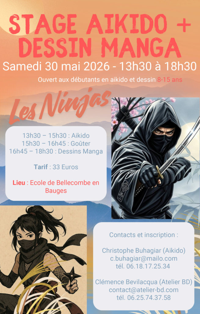 Samedi 30 Mai 2026, l’Atelier BD s’associe à Christophe Buhagiar, enseignant en aikido, pour proposer aux jeunes de 8 à 15 ans un stage de dessin manga + initiation à la pratique de l’aikido sur le thème des NINJAS.